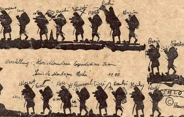 GIORDANO LEOPARDI: Expeditionserfinder, Routenverführer, Lahnetaler, Didi Danger, Big Snowener LOUIS DE MONTAGNE CLOCHER: Einheimischer Führer, englischer Abgesandter, V-Man, Bürgerking INA: Fahnentragende Quotenfrau, Mutter CHRISCHI: Fernöstlicher Beirat, Gnukackeanbeter,Massörinstruktör,Verschläfer,Amphi Man MIKE THE WILD: Doktor für faltbare Gipfelkreuze PAUL: Versorgung, EPA-in-Rotwein-Koch, Extremrunner BOCKI: Miner, Frauenverbraucher, Geschichtsvereinsvorstand, Gletscherbrillen MEIER 2: Ersatzteilfabrikant, Katzendompteur, Vater MAURICE DE MONT MORT: Pensionierter Schrottmotorrad-NSU(eigentlich DKW)-fahrer, Photos, Whisky! KRATO: Teerstraßenextremkletterer, Yeti, seelischer Beistand, MOZART: Cop, iss’n---- jetzt, EWU: Bumerangohrfänger, Rückwärtsgänger, Sauerstoff PETE: Immernochschneeschuhfahrmützenspezialüberdiebrillezieher, RUMMEL: Broanschwaga Betäubah, Wie geht’s uns denn??!!, noch’n Extremrunner, MEIER 1: Vogelleichenträger, Firmenretter, Hesse FRÄNKI: Combuta & Fanne HEYNKES: Kein Hohldreher, Gibtsschonlangenichmehr, Woisserblosshin, vielleicht Bayer RUDI: Mongschäär, Scharmöhr, Salomon Völkl, Tabledancer JÜRGI: Der Kusäng, Advokat, Verpoorten