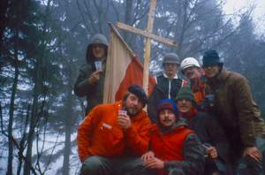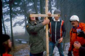 Das allererste faltbare Gipfelkreuz überhaupt. Leicht davon verdeckt, erkennt man, immer noch mit Blechmütze, den stolzen Erfinder und Konstrukteur.
