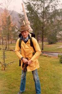Hier sieht man den großen Führer mit dem am Rucksack befestigten Zweibein des "Feistanten". Er trägt eine Trekkinghose der bekannten Marke "Hoolareidullijöh". Es handelt sich hier um das Modell "Verschafft mir Berge, ich will jodeln".