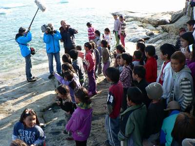 Ankunft in Kullorsuaq unter großem Hallo der Schulkinder. Auf Platte gebannt vom NDR. |