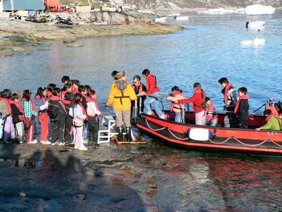 Die Kinder werden im Polar Cirkel Boot eine Runde ums Schiff gefahren. |