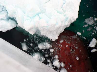 Die FRAM küßt das Eis an der nördlichsten von uns erreichten Stelle. 79.40.953 N / 069.14.737 W |