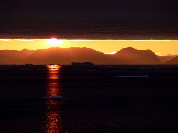 Sonnenuntergang auf grönländisch. Die Berge sind auf Ellesmere-Island in Kanada. |